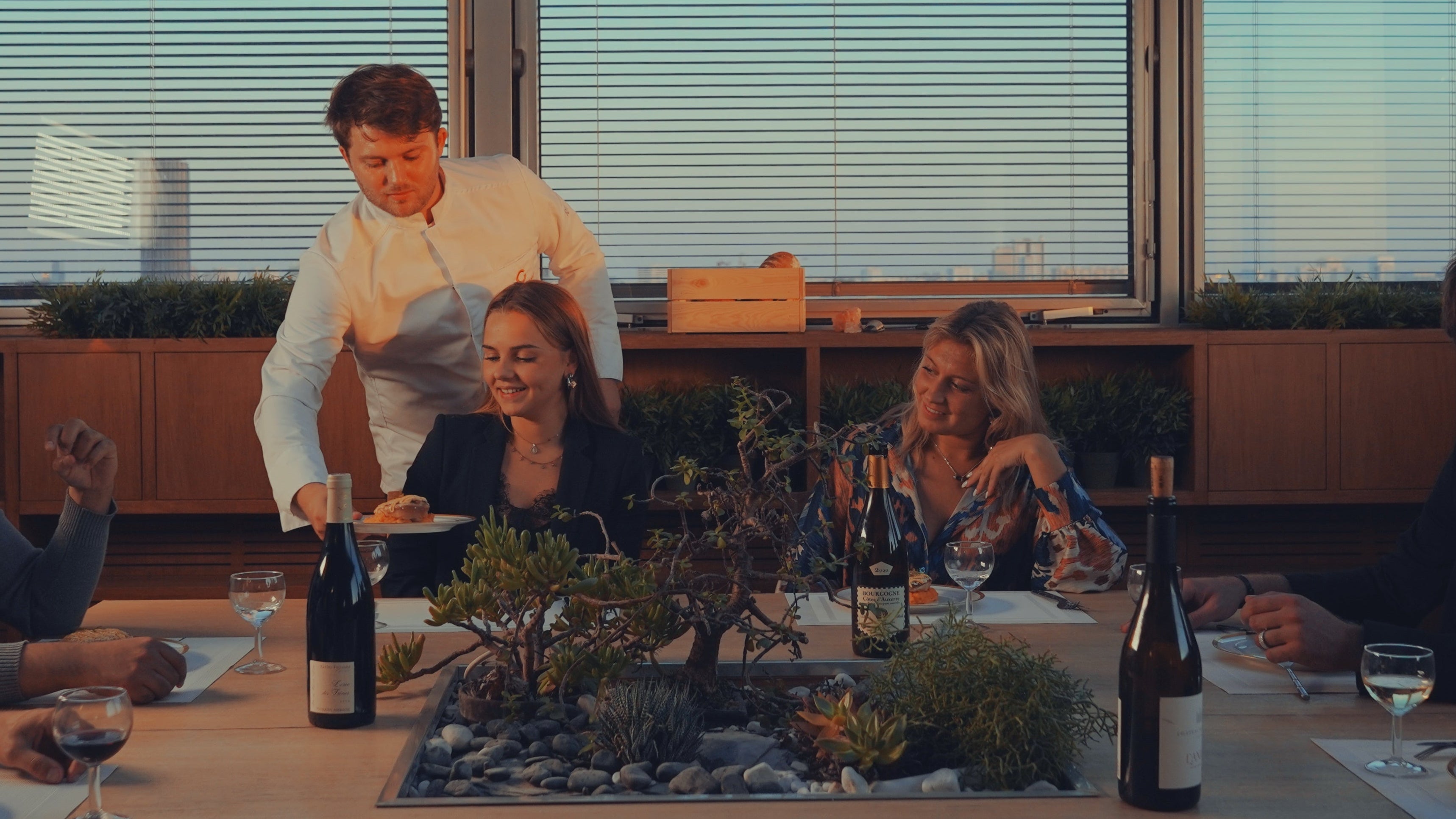 Un chef privé GetChef qui cuisine et sert chaque plat à table pour une expérience digne d’un restaurant gastronomique.